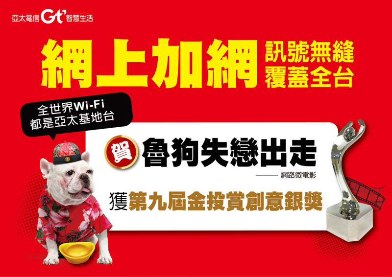 亞太電信日前獲得紐約美國行銷協會「艾菲獎」─2016大中華區銀獎後,又再次獲獎!於2015年中與雅虎奇摩合作所推出的【魯狗失戀出走】網路微電影,由於魯狗的眼神時而哀怨動人,時而調皮討喜,生動表情深深擄獲網友的心,日前獲頒2016第九屆金投賞媒體公司組創意銀獎。