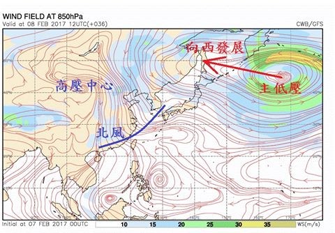 鄭明典就PO出明晚8點的預測氣流圖,他說明,850mb的北風前緣已經到達台灣附近,降溫應該在9日開始。此外,還有一個重要的天氣特徵,看看日本東方海面的大低壓,低壓中心往西拉長,可以看成是新的低壓中心在西側發展,也可以看成是整個低壓「重心」向西偏移。通常中緯度天氣系統都是由西向東移動,偶爾才會出現這樣的由東往西偏移的現象,這個特徵對冷空氣的流動路徑影響很大。