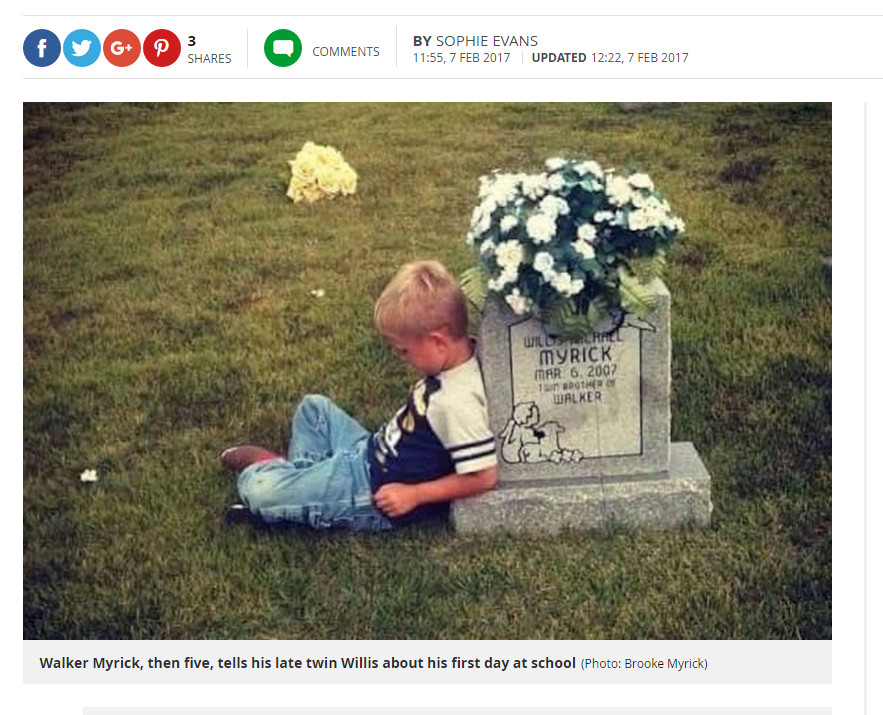 沃克(Walker Myrick)背靜靜靠墓碑旁,這是他雙胞胎哥哥威利斯(Willis)的安眠地,而他正在告訴哥哥今天上學發生的事。綜合外媒報導,威利斯死於雙胞胎兒輸血症候群(TTTS),是一個因不成比例的血供產生的併發症,由此導致高發病率及高死亡率。