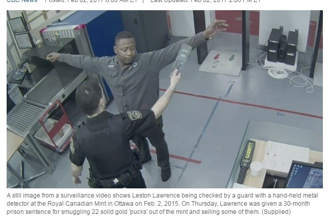 加拿大皇家鑄幣廠的一名前員工,因在受僱期間偷走價值16.5萬加幣(約新台幣393萬元)的黃金,並且偷偷從肛門塞入進直腸來躲避安檢,遭判處30個月有期徒刑,以及19萬加幣(約新台幣452萬)罰款。
