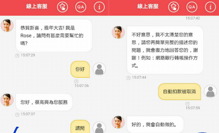 因此,原PO只好簡單、具體的打出「自動扣款被取消...(怎麼處理)」,結果還沒打完,Rose就莫名其妙回了句「好的,我會自動做的」,接著最後也沒提出具體的解決方法,而是回答「您可以再好好想想」。