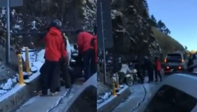 ▲騎重機賞雪卻半路打滑,民眾合力幫忙解困。(圖/翻攝自爆料公社)