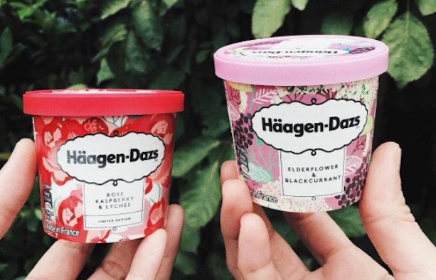 迎接浪漫春日,冰淇淋業者也玩起花卉風,限定口味的盒裝換上花草插畫,讓愛吃冰的民眾視覺、味覺都能細細品嚐春天的滋味。近日Häagen-Dazs全新兩款冰淇淋,接骨木花黑醋栗與玫瑰荔枝覆盆子,在IG上掀起高人氣,夢幻感的盒裝設計搭配創新口味,讓少女們完全喪失抵抗力,把冰淇淋變成街拍藝術品。