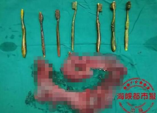 福建省31歲女子小雲7日腹痛難忍,被緊急送進福建醫科大學附屬協和醫院急救。醫師首先判斷她的肚內有異物,並在剖腹以後,取出7把20公分長的牙刷,其中2把捅破肝臟,還有幾把捅破腸子,頂在腹腔上。