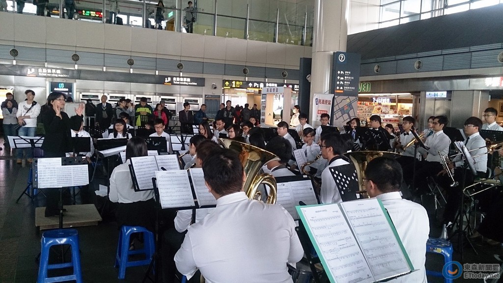 今日的演出由林晉名及林律安兩位老師擔任指揮,團員們在車站大廳賣力演出管樂合奏、銅管五重奏及絲竹樂曲等多首曲目,時而澎湃激昂、時而輕快柔美的旋律,青年學子們個個表情專注又認真,精采又高水準的演出,贏得旅客目光,紛紛停下腳步、陶醉不已。