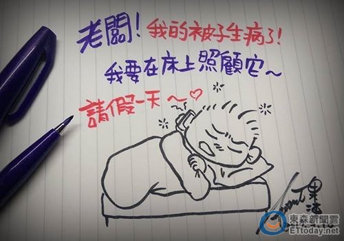最近在網路上流傳一張照片,有網友隨手畫了一張圖,一個人就躺在床上、躲在溫暖的被窩睡覺。上面更寫了幾行字,「老闆!我的被子生病了!我要在床上照顧它~~請假一天~~」