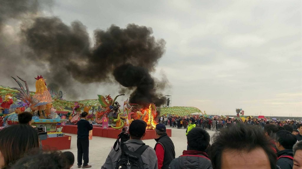 今年台灣燈會共分為虎尾及北港兩大燈區,共有50公頃,是史上最大規模燈會,而12日16時許竟傳出主燈區旁的花燈競賽「燈王」起火,冒出濃濃黑煙,許多網友也把影片和照片PO到臉書社團「爆料公社」,所幸火勢很快被工作人員撲滅,未延燒其他花燈,也無人受傷。