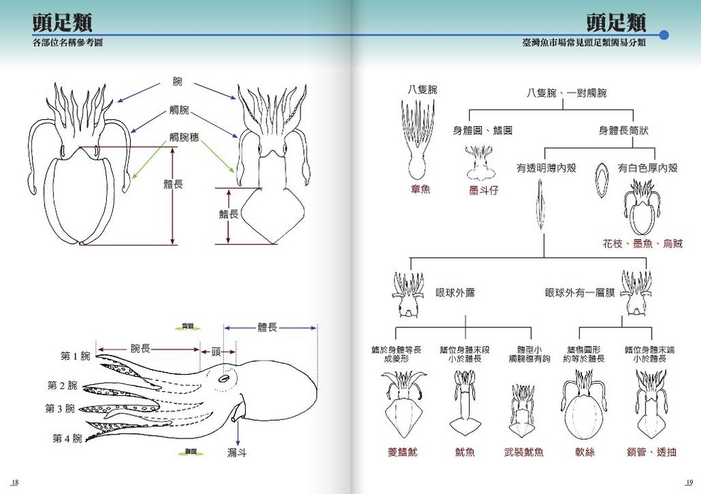 圖鑑指出,章魚如同一般人認知擁有8隻腕,花枝、墨魚、烏賊則是有8之腕之外,另外又多一對觸腕,且體內還有白色的厚內殼。