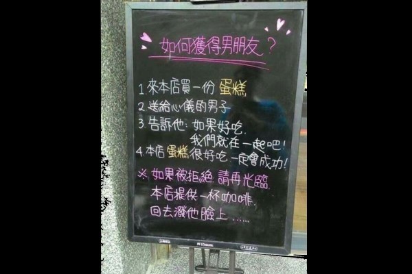 有網友在臉書社團「爆廢公社」po出一張照片,並且發文寫道,「女生晚上想告白先去買蛋糕好了。」從照片中看到,這是一間咖啡廳門口放了個宣傳看板,上頭寫著「如何獲得男朋友?」