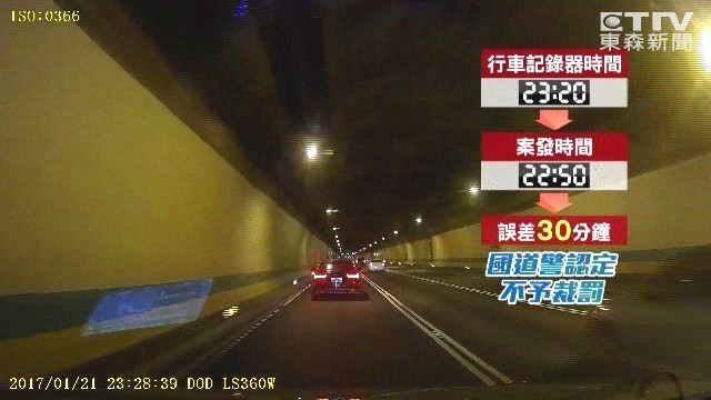 有民眾日前開車載妻小上國道,卻被一輛黑色轎車惡意逼車,他不敢挑釁對方,先打電話報警,事後再將行車紀錄器畫面送到國道警察檢舉。警方認定對方確實違規,卻因為紀錄器時間有30分鐘「時差」,告知民眾「無法受理」。