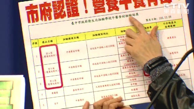 市府說,新市府團隊上任後,市長林佳龍要求全力改善校園食安的把關強度,衛生局採行「每月抽驗校園午餐菜餚」及「食材至源頭供應商抽驗」機制,針對菜餚、食材抽驗,若檢驗不合格,立即通知教育局、農業局輔導管理,並裁罰違規業者;而每次檢驗結果也都公布於衛生局網站食安專區。