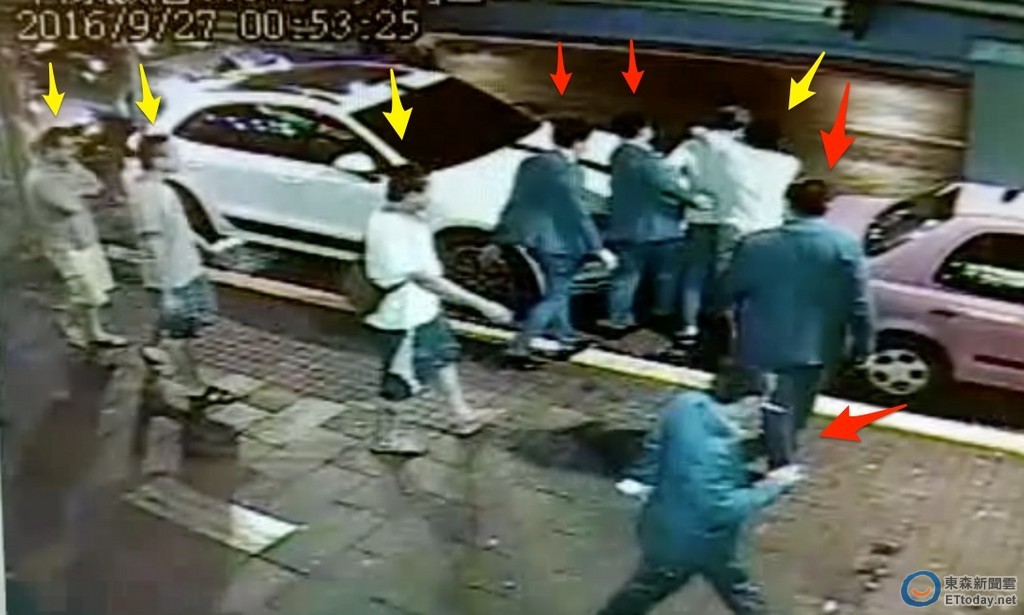 ▼在押人時,正式成員都會穿西裝(紅箭頭),外圍成員則只能穿便服(黃箭頭)。(圖/記者柳名耕翻攝)