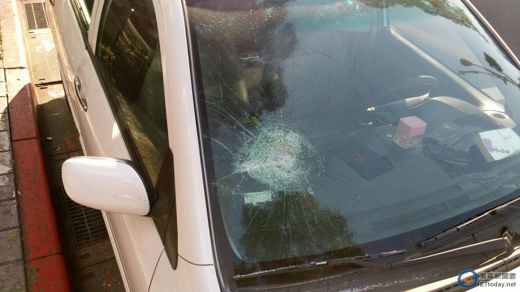 ▲梁男的轎車擋風玻璃被砸破。(圖/記者楊佩琪翻攝)
