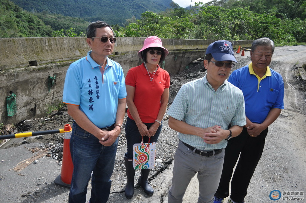 ▲去年10月豪大雨過後,台東縣東河鄉泰源往七塊厝的產業道路受創嚴重,縣長黃健庭現場勘察情形。(圖/台東縣政府提供,下同)