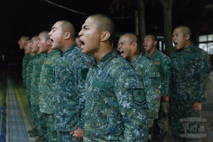 文圖/軍聞社陸軍海龍蛙兵141期儲訓隊員19日晚間為即將到來的二階段鑑測進行精神動員,學員們大聲誦讀「海龍蛙兵信條」,矢志完成最後挑戰。(軍聞社郭家良)