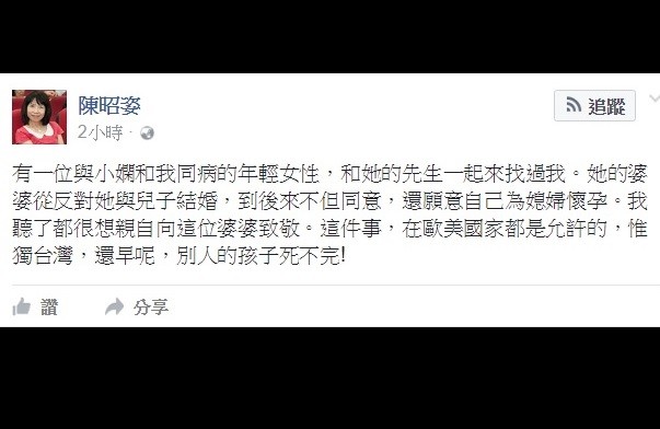 ▼陳昭姿在臉書發文指出,過去也曾遇到與小嫻同病的女性,最後還是婆婆代為懷孕,生下金孫。(圖/翻攝自陳昭姿臉書)