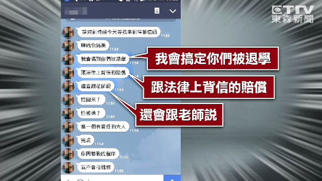 勞資協商時,學生還拿出跟永采烘焙坊的LINE對話,指控對方曾威脅「妳們這麼惡劣的弄公司,我準備提告,我會搞倒妳們被退學,跟法律上背信的賠償,還說學校教務長知道了,他們說你們勸不聽。」家長氣得說,校方可能要記學生小過,做給業者看,似乎就是要學生息事寧人。對此,高雄餐旅大學澄清,不會對學生記過懲處,也會承認他們的學分,絕對會陪學生做後續處理。