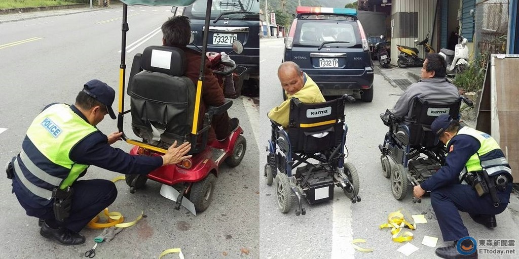 原PO在臉書社團「花蓮同鄉會」分數張照片,只見多名阿公阿嬤坐在輪椅或電動車上,背後則是有名警員蹲在地上,專注地幫忙貼反光紙在椅背上。此景讓原PO看了很感動地說「還以為這位警察叔叔在做什麼?見警車巡邏時突然在這位阿伯的電動車前停下,原來警察叔叔利用他的巧思,用反光紙貼在這位殘障阿伯的電動車後方,讓阿伯的電動車不僅在夜間行駛增加反光作用,也確保後方來車及殘障人士安全,和平派出所的員警超級貼心der」。