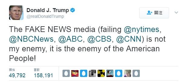 美國總統川普與美國媒體不合眾所皆知,日前推特上發文大罵,「紐約時報(The New York Times)、美國全國廣播公司(NBC)、美國廣播公司(ABC)、哥倫比亞廣播公司(CBS)、美國有線電視新聞網(CNN)不只是我的敵人,也是美人民的敵人」,更稱這些媒體製造「假新聞」。
