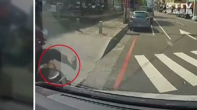 ▲遇救護車未禮讓,阿伯自撞路緣跌倒。