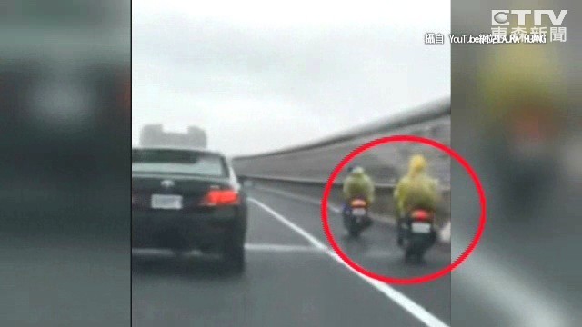 國道五楊高架中壢路段,26日上午11時出現兩名機車騎士騎著一般機車上路,當時下起滂沱大雨,國道上視線不佳,不過2人穿著黃色輕便雨衣,仍以時速70至80公里的速度騎在路肩,其中前方騎士一手控制龍頭,另一手還在滑手機,十分危險。