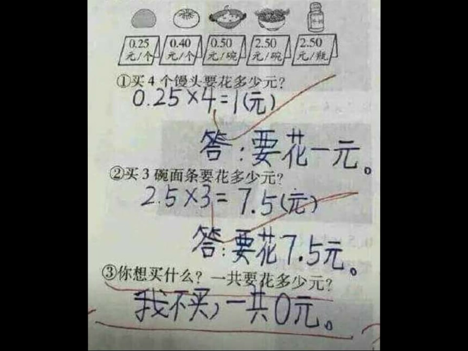 接著試卷出了3道題目,分別是「買4個饅頭要花多少元?」、「買3碗麵條要花多少元?」、「你想買什麼?一共要花多少元?」只見前2道的題目答案都正確,但第3題的答案,老師卻沒打勾,並用「?」來回應,而學生回答的答案,竟然是「我不買,一共0元。」