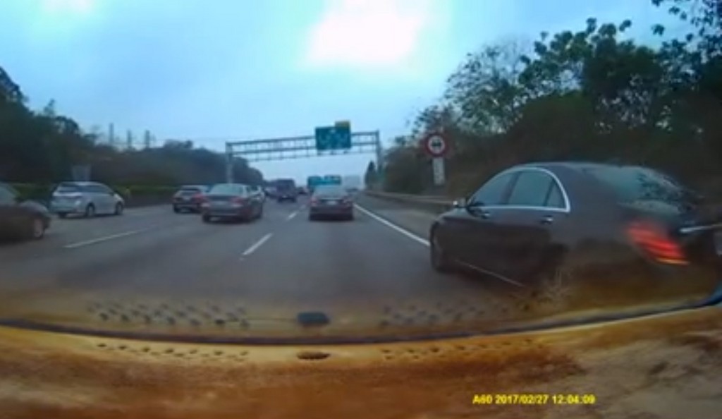 影片中可見,賓士車違規行駛路肩上,疑似看到前方警察,意圖要插隊想回到車道上,害兩車差點撞上,惹惱邱姓駕駛,一路長按喇叭,藉機引起警察注意「B他給警察抓啦,看到路檢,就要給我切下去,你開賓士是囂張啥?我故意按喇叭,讓警察知道,水!」、「中獎了,哈哈哈哈哈哈哈哈......(換氣)哈哈哈哈哈哈哈哈。」