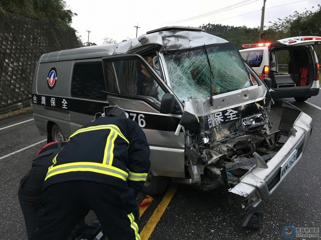 花蓮縣壽豐鄉台11線水璉路段,2日下午將近5點時發生車禍,一輛「台灣保全」運鈔車與一輛貨車發生對撞,運鈔車的駕駛座與車頭撞擊嚴重,兩名保全人員受困,警消獲報趕往救援,將受重傷的2人送醫急救。