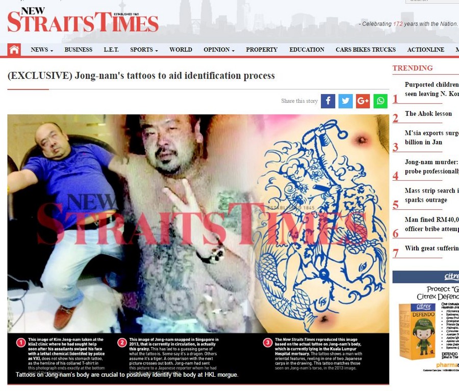 《新海峽時報》獨家取得遇害北韓男子的遺體照和刺青圖案,並稱可以藉此確認是否死者真的是金正男。據報導,日本女記者藤田(Mizumi Fujita)採訪金正男超過10年,見面次數超過30次,雙方相當熟識。金正男曾在2013年時將自己與朋友的照片寄給藤田,照片中他裸上半身,能清楚的看見位於手臂和腹部的刺青,腹部的圖案為一名男子腳踏2條日本鯉魚。雙方經過比對發現,死者遺體上的紋身幾乎跟金正男身上的完全吻合,藉由對比刺青圖案後,能協助警方更加確定死者為金正男。