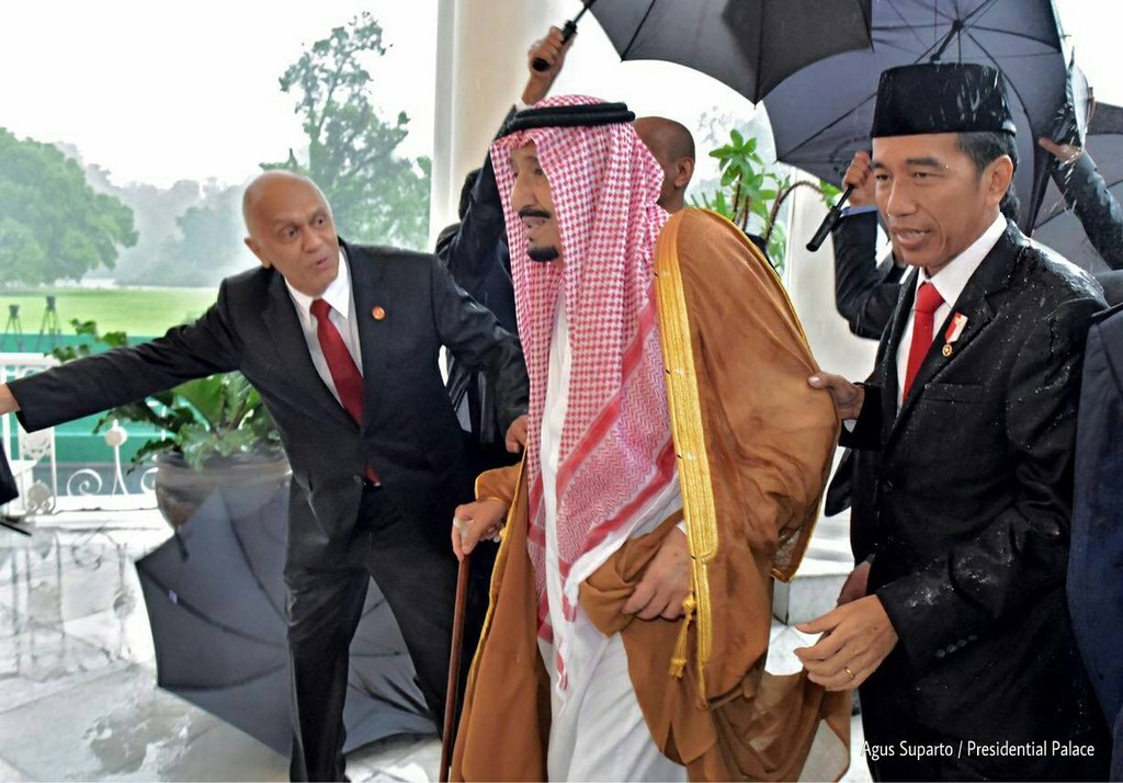 沙烏地阿拉伯國王沙爾曼(King Salman bin Abdulaziz Al Saud)1日抵達印尼雅加達,展開為期9天的參訪,成為近50年來首位造訪印尼的沙國元首。印尼總統佐科威(Joko Widodo)展現誠意,把雨傘交給隨扈,冒雨親迎貴賓進入總統行宮,還自拍一段在總統行宮內的談話,並邀請沙爾曼加入,引起網路熱議。