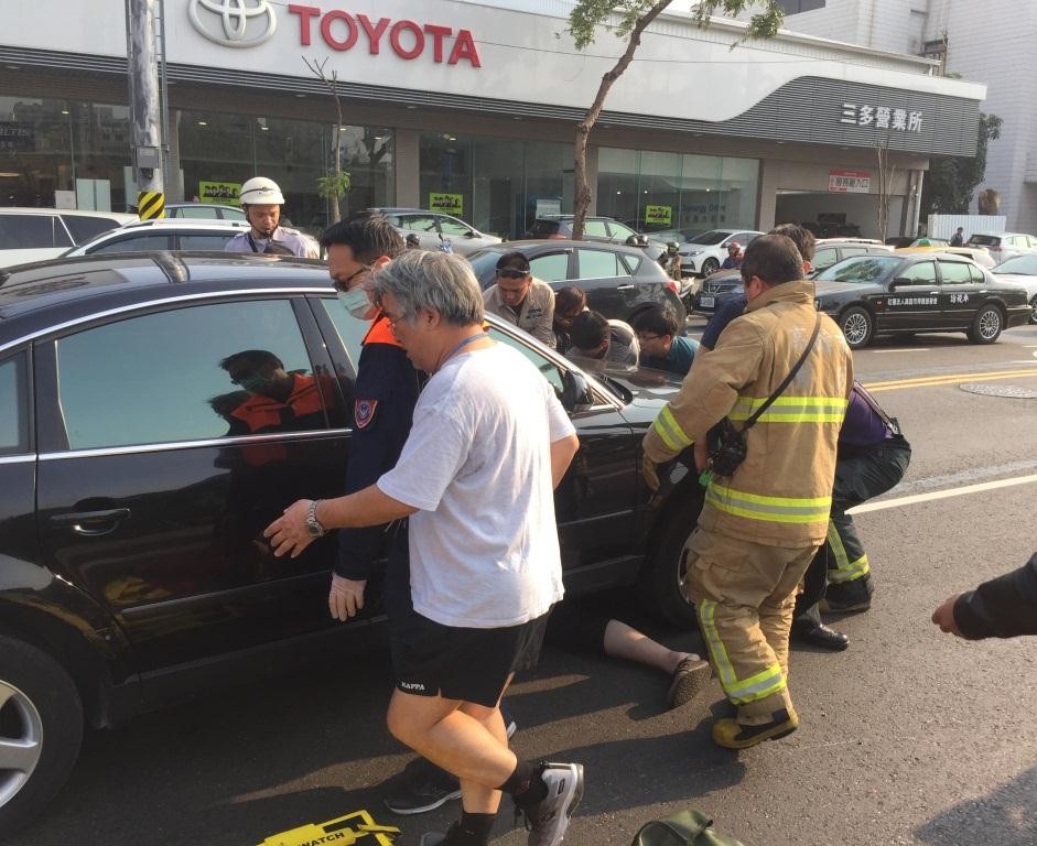 高雄市苓雅區4日下午4時發生一起車禍,一名30歲黃姓男子騎車行經三多路時,與一輛機車發生擦撞後倒地,遭後方一輛轎車閃避不及輾困車底,路人趕緊報案,接著十幾名熱心路人就和警消合力抬起轎車,讓救護人員順利拉出黃男急救送醫。