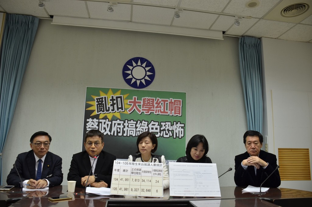 國民黨立法院黨團今日上午召開「亂扣大學紅帽,蔡政府搞綠色恐怖」記者會,黨團書記長王育敏指出,每年陸生來台就學超過4萬1千人,民進黨現在卻拿根本不是問題的「一中承諾書」進行政治操作,「難道是要這些陸生都不要來台就學與交流嗎?」她進一步說,民進黨執政後兩岸關係急凍,現在連大學招攬陸生都受波及,「政府是該檢討自己的兩岸政策,還是急著追究大學是否有辱國格、言行是否『政治正確』?」