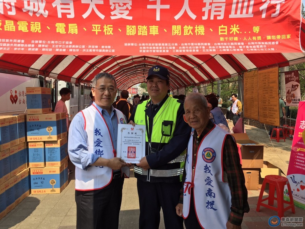 主辦單位台南市南投旅外同鄉會及台南捐血中心,為感謝台南市警五分局,協助辦理本次捐血活動,特致贈「熱心公益」感謝狀表達謝意。