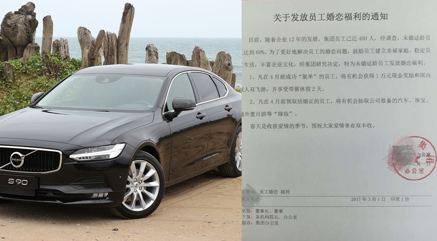 若在4月前完成結婚登記的員工福利更加優渥:「將有機會抽取公司準備的汽車、珠寶、境外蜜月遊等『嫁妝』」。不少網友紛紛按讚留言,「這才是中國好老闆」、「好老闆,求帶走」、「這個世界對單身狗越來越殘忍了」、「真受不了這樣的公司,居然逼婚,還搞獎勵?我只想說,你們還招人嗎?」