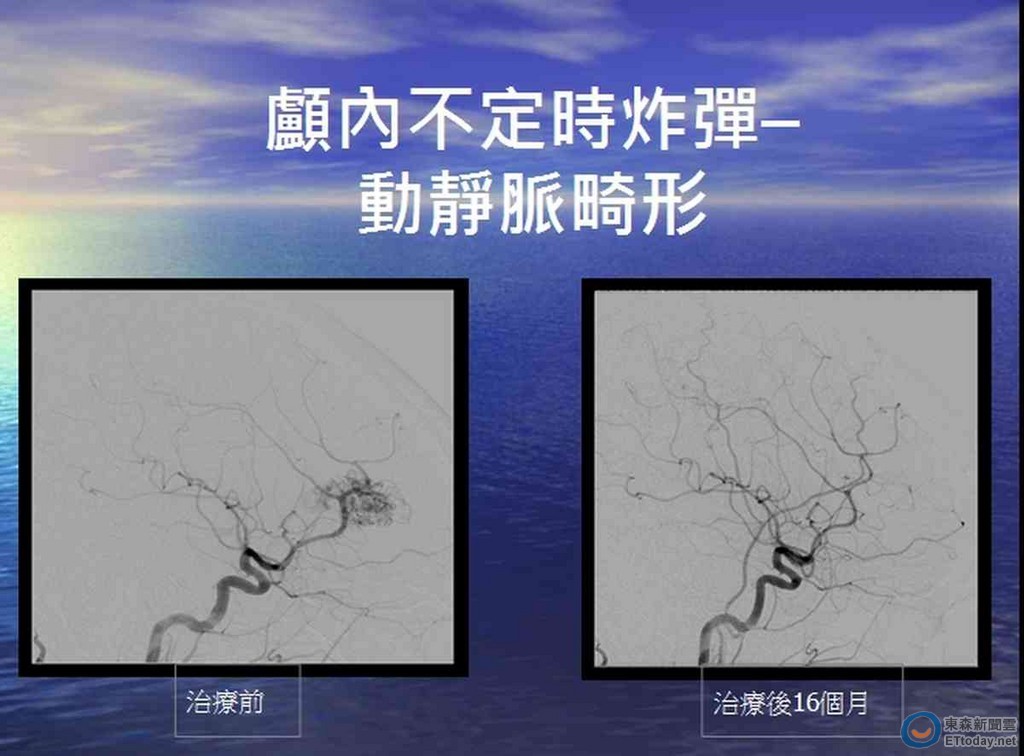 「動靜脈畸形」,大部分為胚胎發育過程中的異常,造成腦部出現動靜脈血管直接連接的先天性畸形,造成腦部血管不正常聚集,導致動脈血液不經微血管而直接注入靜脈,形成一種高流速及高壓力的血液短路,繼而增加腦內出血及中風的機會,而施以電腦刀治療,超過9成病例獲得控制,約2成完全緩解。