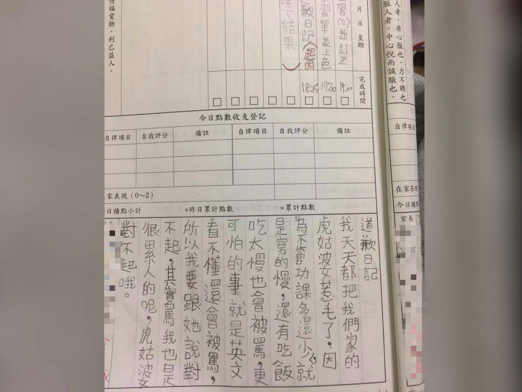 原po上傳的聯絡簿照片中,這位小主人在日記格上寫著「我天天都把我家的虎姑婆惹毛,因為不管功課多或少,就是寫的慢,還有飯吃太慢也會被罵,英文看不懂也會被罵,所以我要跟她說對不起。其實罵我也是很累人的呢,虎姑婆對不起哦。」