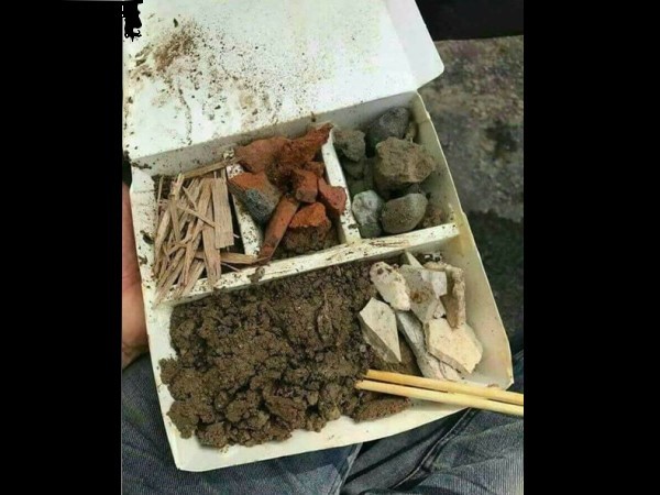 網友在臉書社團「爆廢公社」po出這張照片,並且發文提到「今日的午餐!」從照片中看到,便當盒內裝的並非是我們所熟知的食物,而是石頭、磚頭、碎木、泥土等。事後這張照片也被轉發到「爆料公社」臉書粉絲團,小編還發文笑稱「媽媽說:吃飯菜色要均衡,這樣夠均衡嗎?」