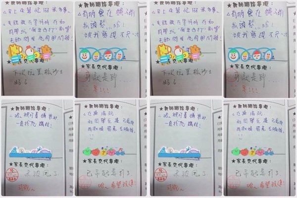 還有一天老師寫到,「哈~~被可蓁嫌很吵,一直找他講話!」沒想到這名老爸回「哈!快被甩了…」老師則回覆「可能。」另外一天的部份,老師則寫「在操場玩和同學互撞,已處理,再麻煩留意右臉頰!」這名老爸竟回「已吊起毒打了。」老師則回「哈,希望改進!」