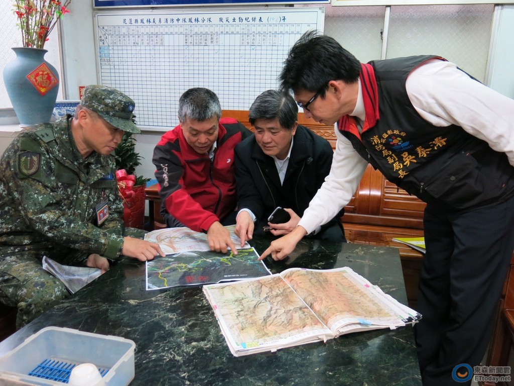 花蓮縣消防局長林文瑞、台北市消防局長吳俊鴻及陸軍花東防衛指揮部中將指揮官賀政,至山難前進指揮所統整6日來搜救路線,研討後續搜救計畫。