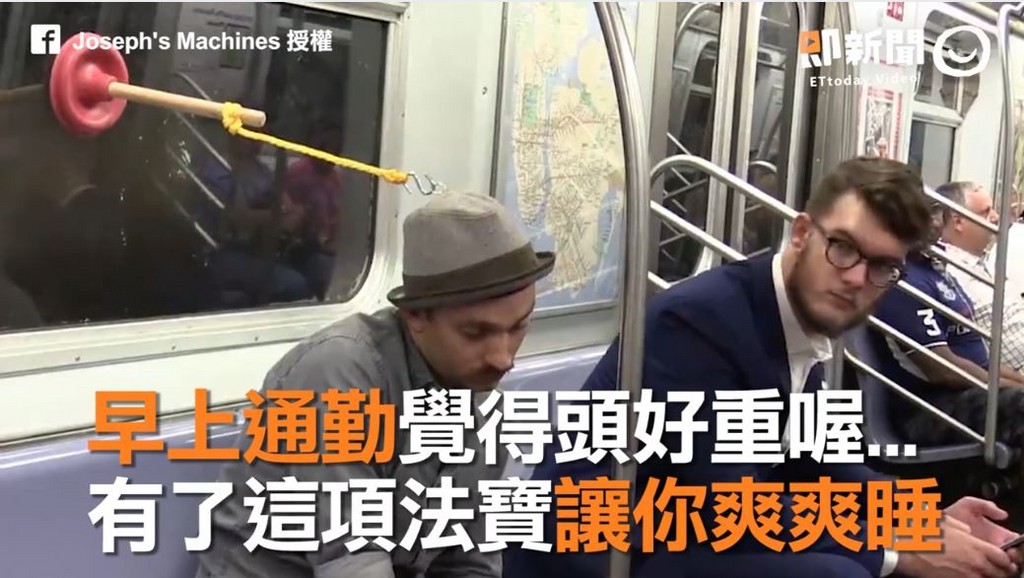 Joseph走上地鐵後隨即拿出他的「補眠神器」,勾住帽子後方就能固定頭部,地鐵不論怎麼晃身體就是不會亂倒,再也不會睡倒在隔壁乘客肩膀,能舒服的睡上一覺。但仔細一看,這項「神器」其實只是馬桶吸盤、彈簧加鉤子的結合,吸引眾多路人的好奇目光,也讓看到的人都不忍不住大笑。