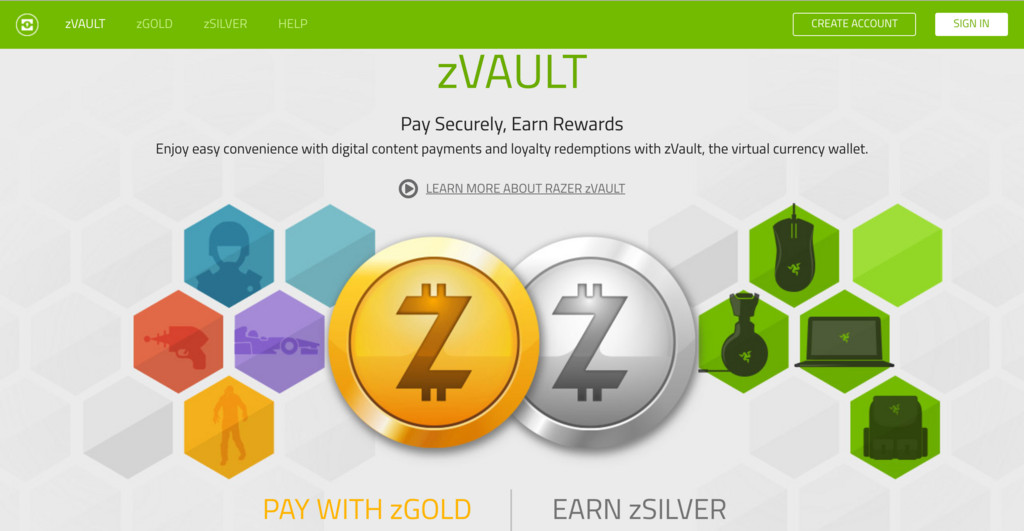 Razer zVault 簡單來說就像是一個交易平台,註冊時需要使用 Razer 的 ID,並預先購買(儲值)30、50 美金以上的金額以換取虛擬貨幣。在 zVault 中,虛擬貨幣也分為 zGold 與 zSilver 兩種,但 zSilver 未來雖然會有不一定的優惠換取折扣,但實質上比較像是刷卡集點的額外 Bonus。