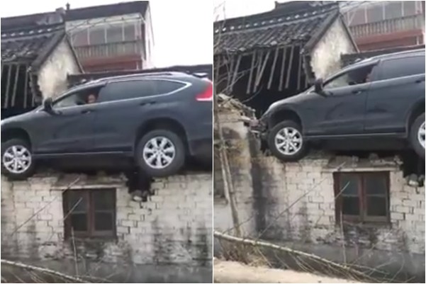 絕世三寶!中國江蘇省泰州市10日發生一起超離奇車禍,一輛休旅車為閃避山輪車而失控,先是撞上路旁水泥護欄,接著因慣性作用一路「飛簷走壁」爬上3公尺高的屋頂,駕駛被卡在車上動彈不得,誇張的情節讓網友全傻眼,直問「到底是怎樣的技術才能把車開得這麼出神入化?」