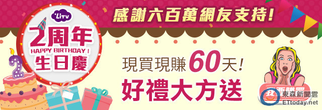 線上影視平台「LiTV 線上影視」為慶祝上線 2 周年,主打超值優惠「買 1 送 2」方案;用戶只要購買一年服務,立即加送 2 個月免費看。除了超值方案,LiTV也推出雙重好康,包括限量「LiTV 招待」好禮,以及影視娛樂 3C 週邊商品放送。