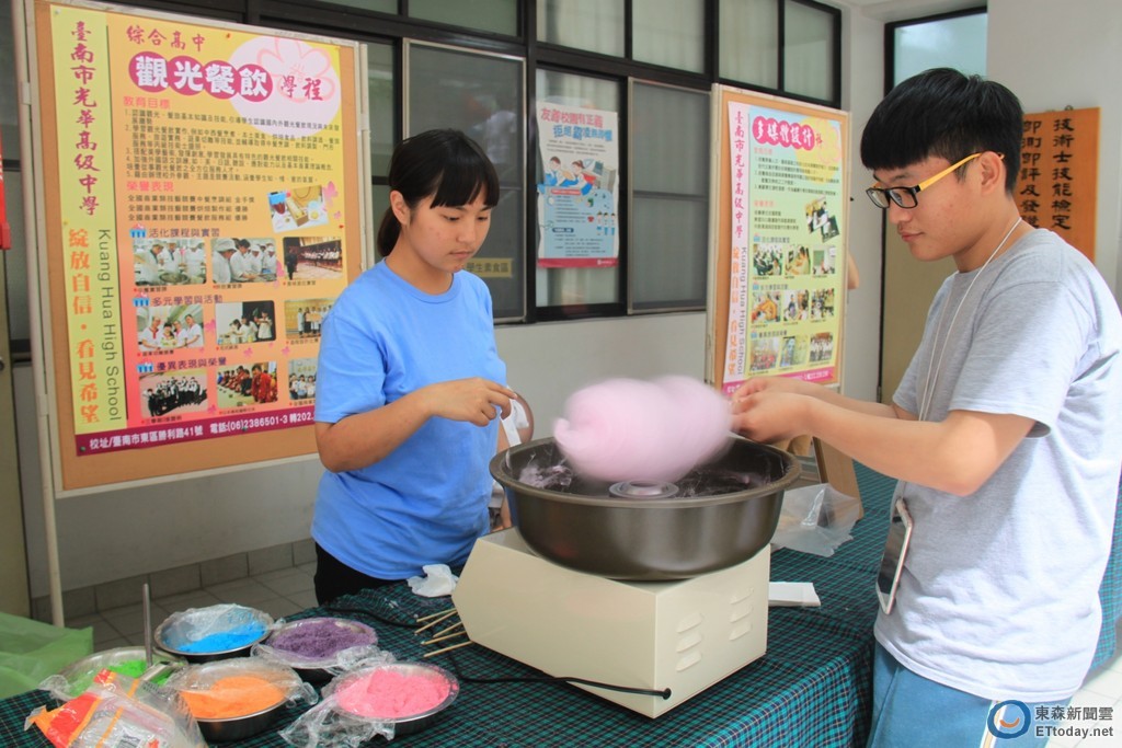 ▲光華高中餐旅群「轉吧,七彩棉花糖」體驗棉花糖製作,別小看這項功夫,還需要熟練轉動才能做出繽紛的棉花糖。(圖/校方提供)