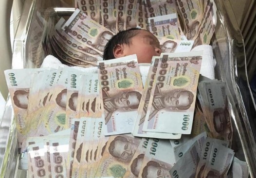 土豪炫富手法再出新招!近日網路流傳一張炫富照,一名剛出生的嬰兒收到土豪阿姨送上的200萬泰銖禮,白花花的千元鈔票鋪在嬰兒身上,被網友譽為史上最貴的棉被,但也有網友認為,讓剛出生的小朋友接觸鈔票,恐導致過敏或是呼吸道疾病。