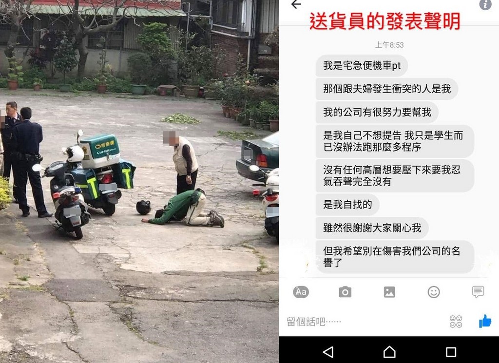 宅配員透過「爆料公社」臉書粉專代發聲明,「我的公司有很努力要幫我,是我自己不想提告,我只是學生而已,沒辦法跑那麼多程序。沒有任何高層想要壓下來要我忍氣吞聲,完全沒有,是我自找的。」