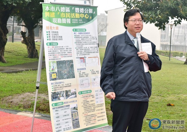 桃園市長鄭文燦13日前往八德區豐德公園,視察「豐德公園興建市民活動中心案」表示,為增加市民活動空間,市府規劃在豐德公園興建市民活動中心,1樓為禮堂,2樓則設置會議室及研習教室,要求八德區公所於今(106)年底完成設計及發包,明(107)年儘速動工,最晚明年12月底前完工。