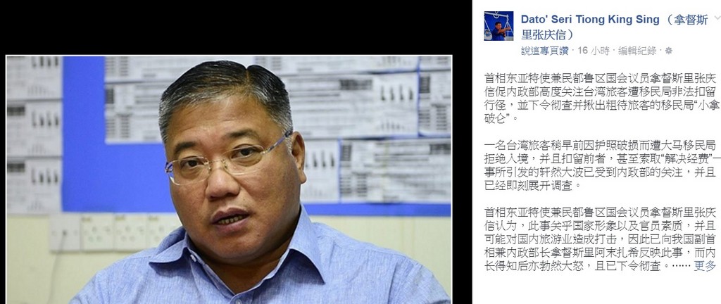 ▲拿督斯里張慶信談台灣女遊客遭海關扣留。(圖/翻攝自臉書,下同)