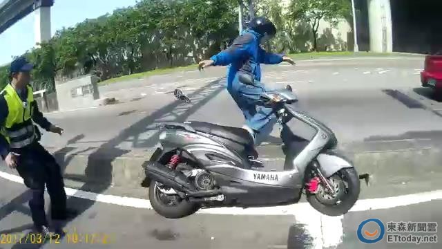 ▲無照的楊姓毒蟲衝撞路檢處後重心不穩撞上分隔島。(圖/記者柳名耕翻攝)