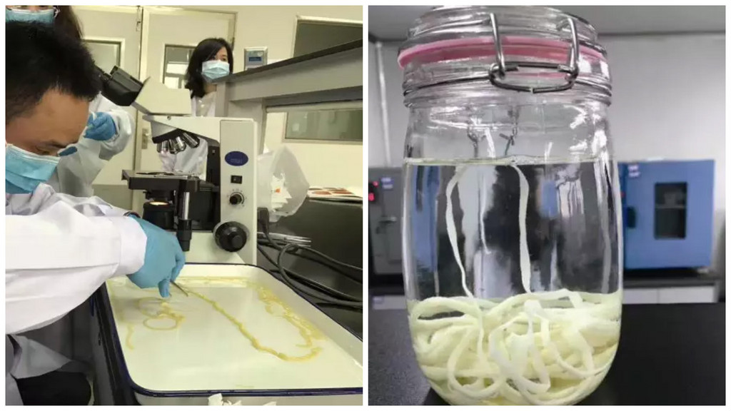 周先生過沒多久後,身體逐漸出現異狀,經常腹瀉,一開始還不以為意,直到今年2月底,他在自己的排泄物中發現一節長20多公分的白色物體,形狀神似竹子,於是將這節「竹子」帶到醫院檢查,但院方建議他到疾病控制部門做處理;經檢驗後發現,這條「竹節」是一種巨大的腸道寄生蟲「帶絛蟲」的孕節,還有蟲卵在裡頭。